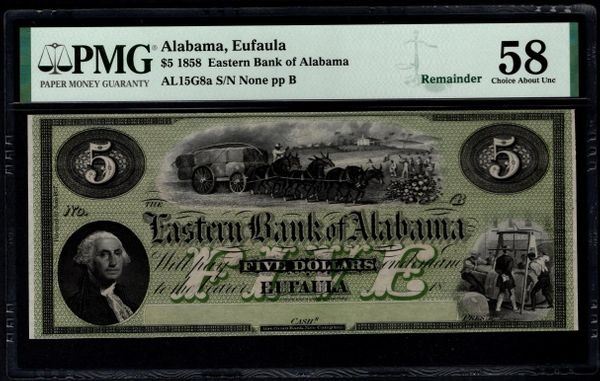 One 1858 $5 Eufaula Bank of Alabama Note PMG 58.