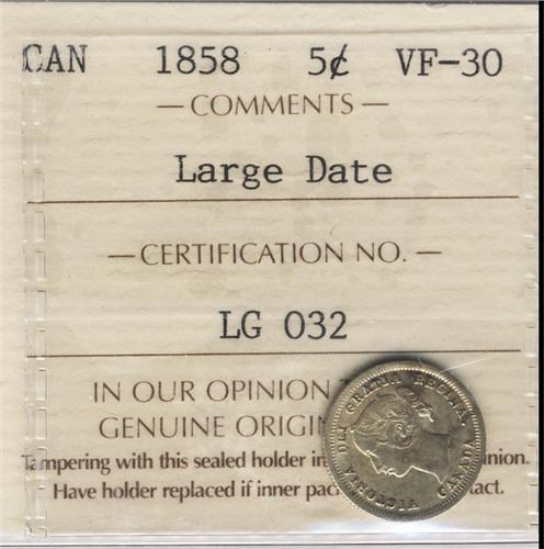 1858 5¢ Large Date. A great example graded ICCS VF30 w/lots of lustre and strong strike
