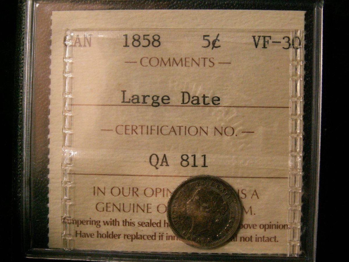 1858 5¢ Large Date ICCS VF30. Darkish tone and well struck.