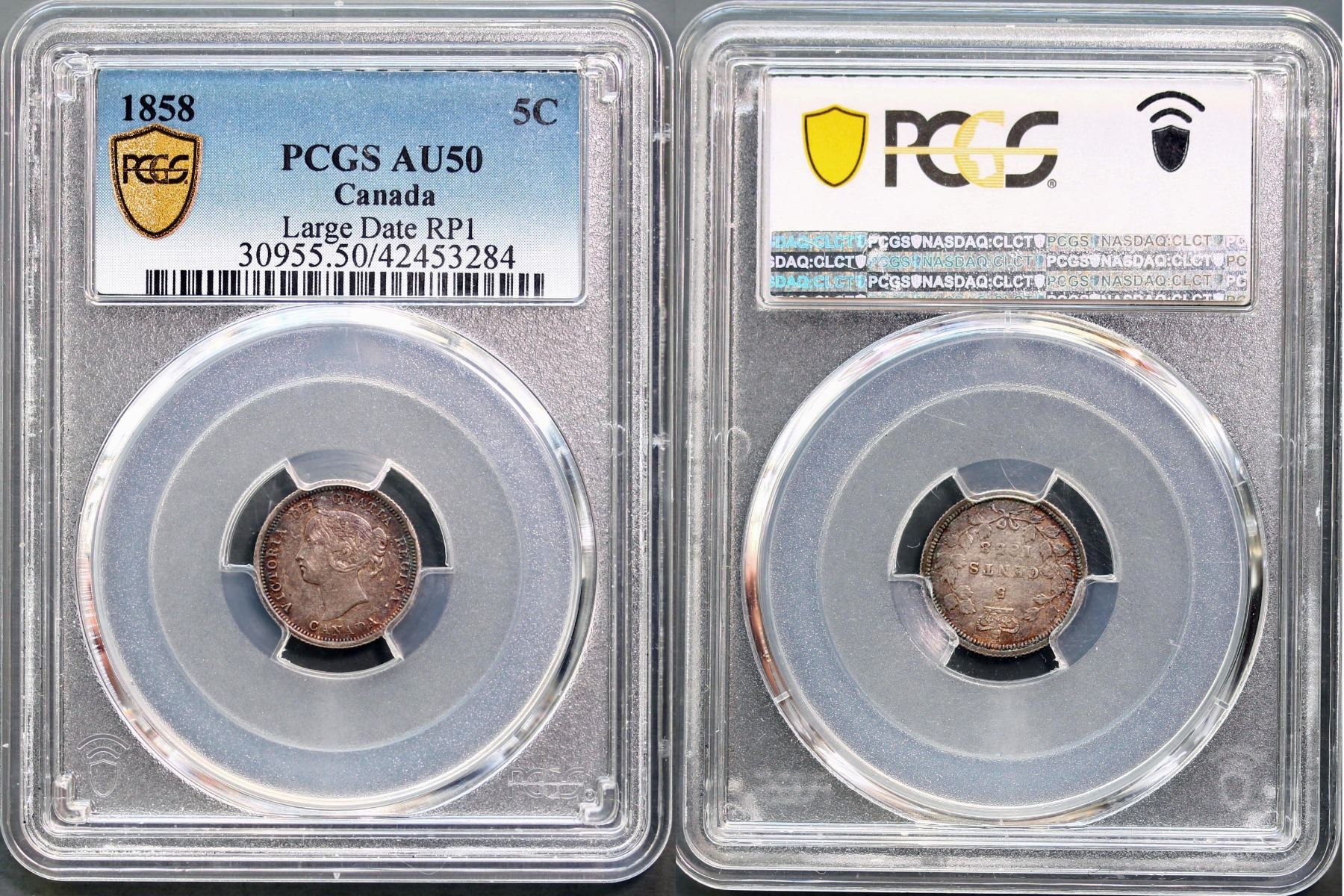 1858 5¢ "Large Date - RP1" PCGS About Uncirculated-50