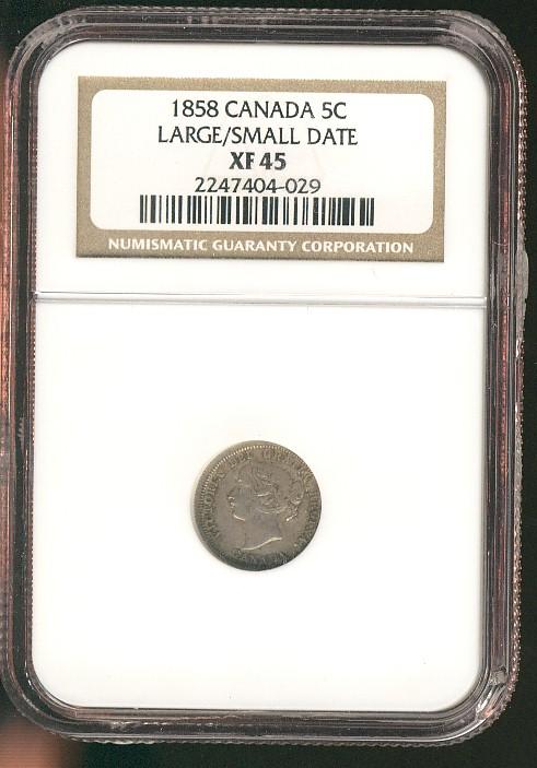 1858 5¢ Lg/Sml date NGC XF45.