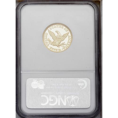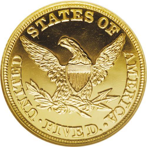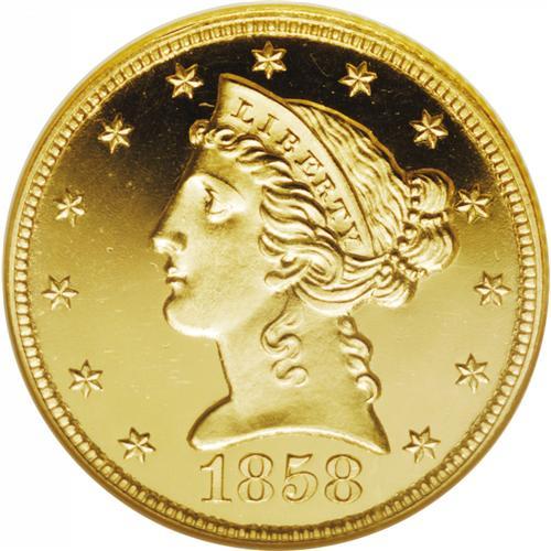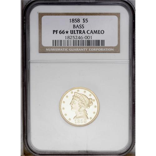 <B>1858<$5> PR66 <img border='0' src='http://www.heritagecoins.com/images/star.gif' width=10 height=10> Ultra Cameo NGC.</B></I> The date is delicately formed, and close to the bust truncation, but each digit is clearly separated from the neck. The placement is above center, with each digit farther from the border. Liberty's nose has a tiny pimple or wart, level with the lower eyelid. Otherwise, the dies appear to be perfectly made. The mintage of proof examples is not known with certainty, but couldn't have been very large. Today, only five examples are accounted for, and this Bass Collection specimen is nearly the finest. A single finer example has been certified by NGC. The following five examples are known: <BR>1. National Numismatic Collection; Smithsonian Institution. <BR>2. Ed Cogan (3/29/1882); J. Colvin Randall; J. Pierpont Morgan; ANS. <BR>3. James Ten Eyck (B. Max Mehl, 5/1922); John H. Clapp; Louis E. Eliasberg, Sr. (Bowers and Ruddy, 10/1982), lot 388; Ed Trompeter. <BR>4. Lorin G. Parmelee; William H. Woodin; Waldo Newcomer; F.C.C. Boyd; World's Greatest Collection (Numismatic Gallery), lot 412; J.F. Bell; "Memorable," lot 359; King Farouk (Sotheby's, 2/1954), lot 253; Ullmer, lot 446; Mocatta Metals; 1979 ANA (New England), lot 176; Dr. Nelson Page Aspen (Bowers and Merena, 8/1989), lot 551; Auction '90, lot 1323. <BR>5. The present specimen. <BR> Deeply mirrored fields surround incredible frosty yellow-gold devices to provide a stunning physical appearance. The cameo contrast is remarkable. Sharply struck as it should be, with every design element perfectly detailed. A few tiny lint marks, especially on the reverse, serve as pedigree identifiers. These are strictly as produced, and aside from the faintest wispy hairlines, the surfaces are immaculate. In his description for the Bass catalog, Dave Bowers reminded his readers of an earlier time when hairlines were called "haymarks," further noting: "the trivial nature of the marks instantly excuses them in the viewer's eye." The true connoisseur, who appreciates the finest in numismatics, should not worry about the price he or she is about to pay, for that is secondary. Long after the price is forgotten, the true beauty of this remarkable Gem will remain memorable.<BR><I>Ex: Donald S. Hopkins (Stack's, 3/1985), lot 807; Harry W. Bass, Jr. (Bowers and Merena, 11/2000), lot 469.</B></I>