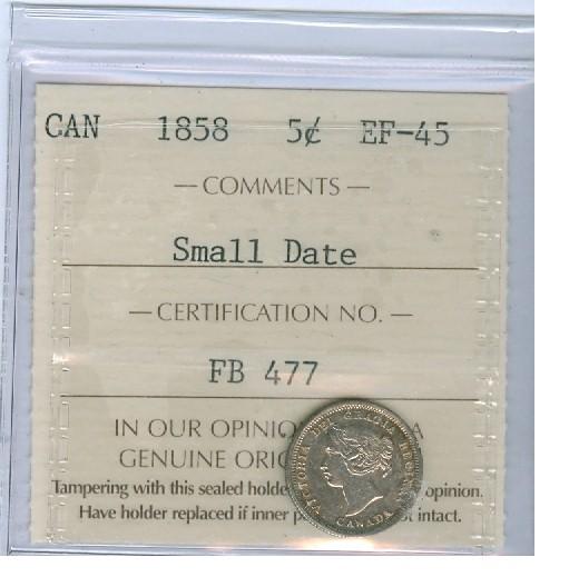 1858 5¢ Small Date ICCS EF45. Attractively toned.