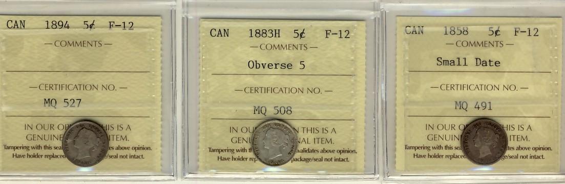 1858 5¢ Sml, 1883H Obv 5 & 1894 F12. Lot of 3 ICCS graded coins.
