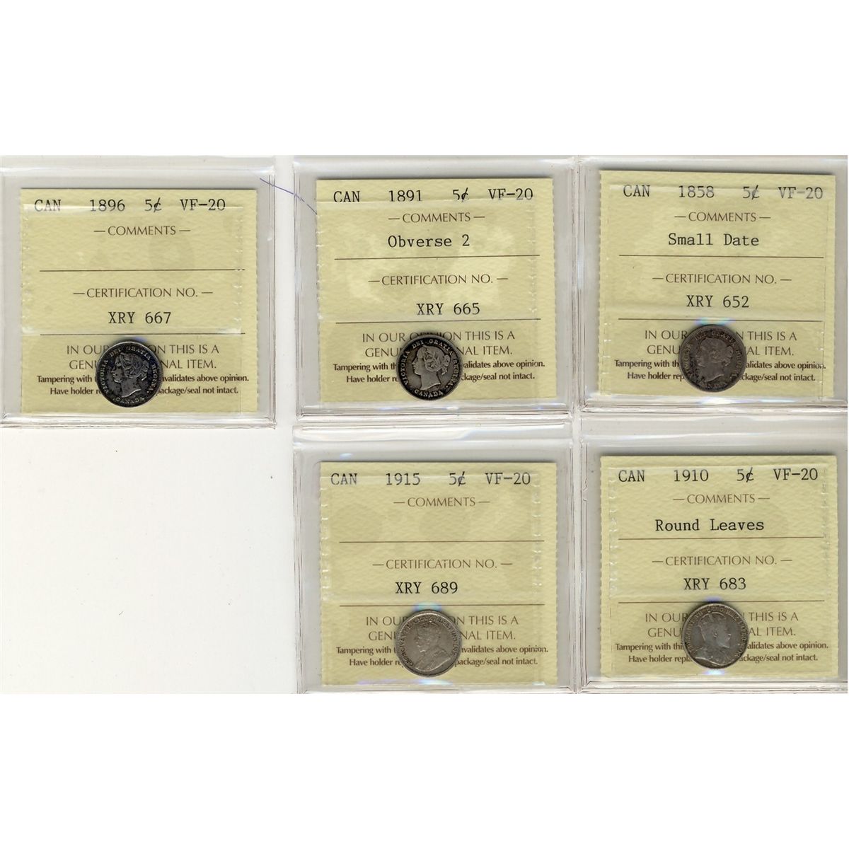1858 5¢ Sml Date, 1891 Obv 2, 1896, 1910 RL & 1915 ICCS F15. Lot of 5 coins.