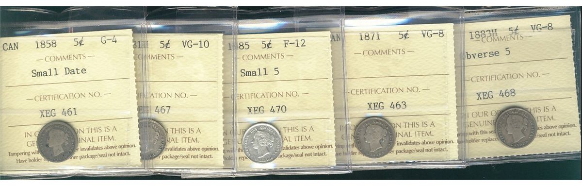 1858 5¢ Sml Dt G4, 1881H VG10 & 1885 Sml 5 F12 along with 1871 & 1883H Obv 5 5¢ ICCS VG8 Lot of 5 coins.
