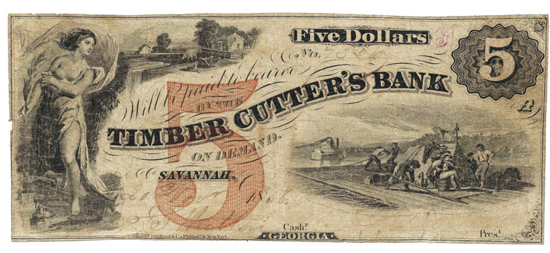 One 1858 $5 Timber Cutter's Bank, Savananna, GA Bank Note - Pinholes