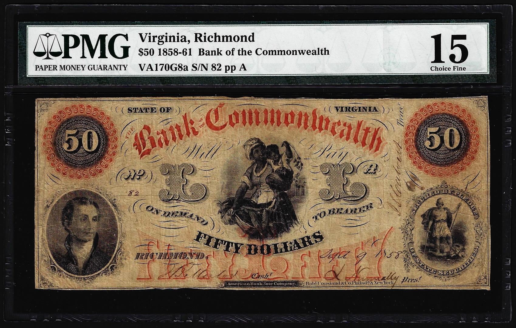 One 1858 $50 Bank of the Commonwealth Richmond, VA Obsolete Note PMG Choice Fine 15. PMG Certified.