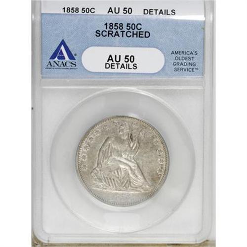 <B>1858 50C --Scratched--ANACS. AU50 Details.</B></I> NGC Census: (21/267). PCGS Population (41/232). Mintage: 4,226,000. Numismedia Wsl. Price for NGC/PCGS coin in AU50: $167. (#6293)<BR><BR><B>Coin Engraver:</B> Christian Gobrecht<BR><BR><b>Shipping:</b> Coins & Currency (<a target="_blank" href="http://www.heritageauctions.com/common/shipping.php">view shipping information</a>)