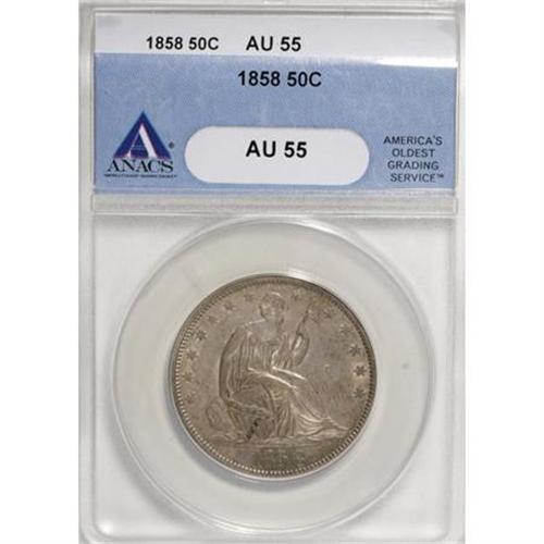 <B>1858 50C AU55 ANACS.</B></I> NGC Census: (31/218). PCGS Population (29/182). Mintage: 4,226,000. Numismedia Wsl. Price for NGC/PCGS coin in AU55: $225. (#6293)<BR><BR><B>Coin Engraver:</B> Christian Gobrecht<BR><BR><b>Shipping:</b> Coins & Currency (<a target="_blank" href="http://www.heritageauctions.com/common/shipping.php">view shipping information</a>)