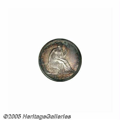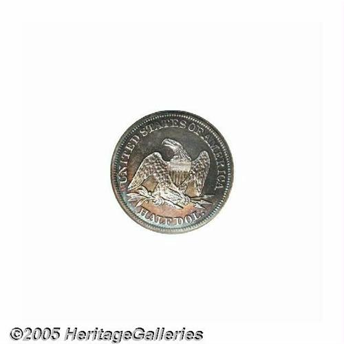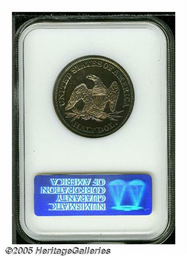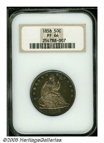 <B>1858<50C> Half Dollar PR64 NGC.</B></I> Splendidly toned in golden-brown, navy-blue, and plum colors. The devices are frosty and exhibit noticeable contrast with the mirrored fields, however, the older generation NGC holder does not mention a Cameo designation. A few small planchet flaws (as made) are encountered on the obverse field. Well struck except for the eagle's left (facing) ankle. The scarcest proof issue between 1858 and the final year of the series, 1891. Population: 15 in 64, 9 finer (6/05).