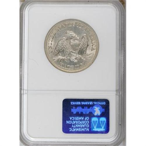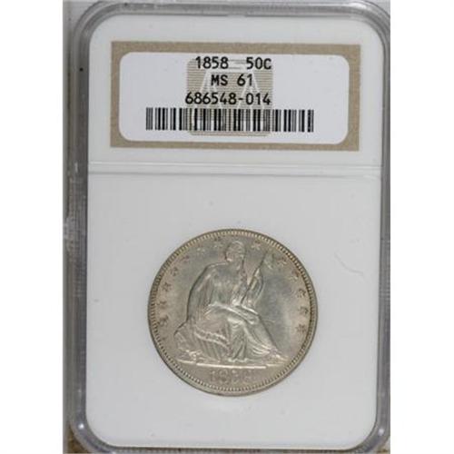 <B>1858 50C MS61 NGC.</B></I> NGC Census: (23/125). PCGS Population (14/122). Mintage: 4,226,000. Numismedia Wsl. Price for NGC/PCGS coin in MS61: $550. (#6293)<BR><BR><B>Coin Engraver:</B> Christian Gobrecht<BR><BR><b>Shipping:</b> Coins & Currency (<a target="_blank" href="http://www.heritageauctions.com/common/shipping.php">view shipping information</a>)