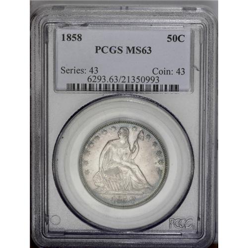 1858 50C MS63 PCGS. The obverse shows touches of cobal 1858[50C] MS63 PCGS.