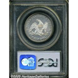 <B>1858 50C MS63 PCGS.</B></I> The obverse shows touches of cobalt-blue and mauve toning at the borders, and a whisper of light mauve color visits the reverse periphery. Nicely struck, with a few minute obverse marks that limit the grade.