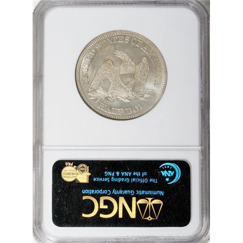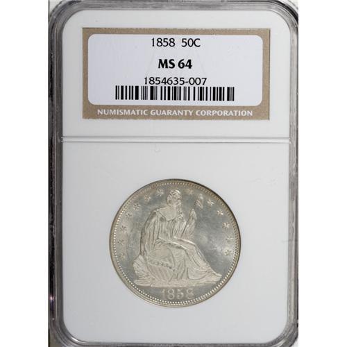 1858 50C MS64 NGC. The lightly frosted devices have ex
