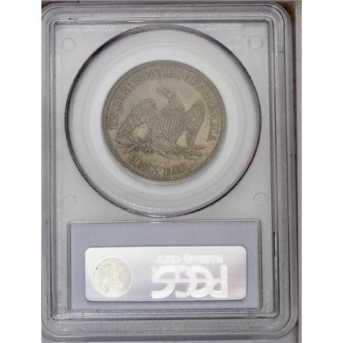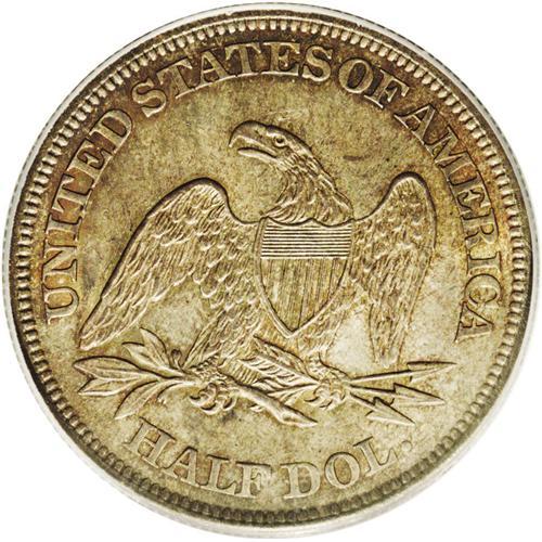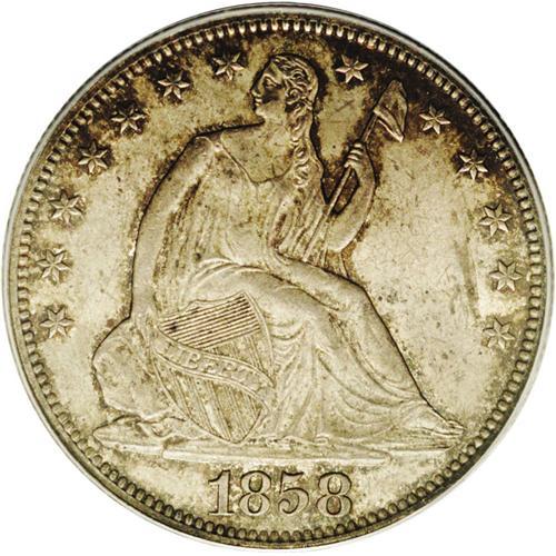 <B>1858<50C> MS64 PCGS.</B></I> As usual on this No Motto issue, the striking details are sharply struck. Also, the mint luster is thick and frosted, being readily apparent beneath the medium density gray patina that deepens to russet around the obverse periphery. Close examination reveals a few abrasions, but none are readily apparent beneath the thick overlay of original gray patina.