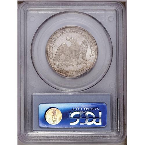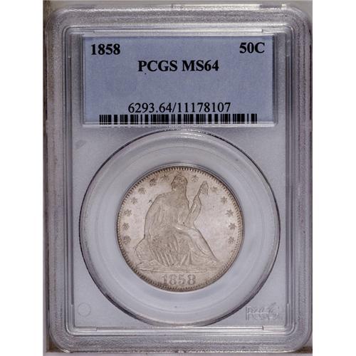 <B>1858<50C> MS64 PCGS.</B></I> Golden-gray surfaces exhibit pleasing field to device contrast as the coin is viewed from various angles. The design features are well brought up throughout, including strong delineation on Liberty's head and foot. Light scuffs and contact marks, especially on the obverse, define the grade. Population: 52 in 64, 13 finer (3/06). <BR><BR><B>Important notice:</B> Heritage usually auctions material at the rate of 200-250 lots per hour. On some occasions eBay Live bid software or the Internet may not be able to keep up with the pace of the auction. We recommend placing a realistic absentee bid now as insurance to avoid disappointment. Occasionally the auctioneer may eliminate or reject an eBay Live bid, and the auctioneer may also reopen a lot after the close of the eBay live bidding (usually because we missed an audience bid), and may reject your bid even if it shows you as the winning bidder. By bidding via eBay Live, you agree that Heritage may award the lot to another bidder at its sole discretion under the circumstances described above or any other reasonable circumstances. Since eBay bids are not shown to us until we open the lot on the floor, we treat those bids just like floor bids. In most cases the floor responds before the eBay bid is presented to us, due to Internet lag time, so for consistency we have made it a policy that floor bids are always considered first over tie eBay live bids. Also please note that all Heritage lots purchased through eBay Live carry a 20% Buyer's Premium. Please make sure you read the Terms and Conditions before you bid. This lot is being auctioned in conjunction with a live floor auction by Heritage Galleries & Auctioneers. All final auction and invoice information will be supplied by Heritage Galleries & Auctioneers, and all other information should be considered preliminary. Lot:2004 <BR><BR><B>Winning Notification and Billing:</B> After the FINAL session in this auction is complete, Heritage will send e-mail and snail mail invoices. This process normally takes several days. All final auction and invoice information will be supplied by Heritage Galleries & Auctioneers, and all other information should be considered preliminary. <BR><BR>This auction will be conducted on a live auction floor and over the Internet through eBay Live. If you choose to place an absentee bid, please take a moment to <font color='#0000ff'><u><a href='http://pages.ebay.com/liveauctions/help/before/laabsentee.html'>learn how eBay Live absentee bidding works</a></u></font><font color='#000000'>