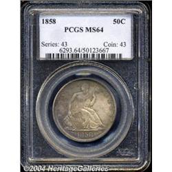 <B>1858<50C> MS64 PCGS.</B></I> Golden-brown, rose-red, and sea-green colors enrich this shimmering near-Gem. Carefully preserved and original. Boldly struck aside from the upper obverse border. A die line below the eagle's beak is of mint origin. Population: 44 in 64, 11 finer (3/04). <BR><BR><B>Important notice:</B> Heritage usually auctions material at the rate of 200-250 lots per hour. On some occasions eBay Live bid software or the Internet may not be able to keep up with the pace of the auction. We recommend placing a realistic absentee bid now as insurance to avoid disappointment. Occasionally the auctioneer may eliminate or reject an eBay Live bid, and the auctioneer may also reopen a lot after the close of the eBay live bidding (usually because we missed an audience bid), and may reject your bid even if it shows you as the winning bidder. By bidding via eBay Live, you agree that Heritage may award the lot to another bidder at its sole discretion under the circumstances described above or any other reasonable circumstances. Since eBay bids are not shown to us until we open the lot on the floor, we treat those bids just like floor bids. In most cases the floor responds before the eBay bid is presented to us, due to Internet lag time, so for consistency we have made it a policy that floor bids are always considered first over tie eBay live bids. Also please note that all Heritage lots purchased through eBay Live carry a 20% Buyer's Premium. Please make sure you read the Terms and Conditions before you bid. </span></font></tr></table></td></tr></table>