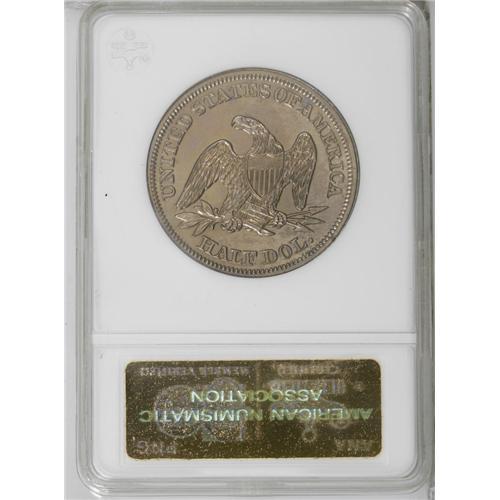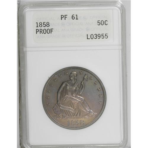 <B>1858<50C> PR61 ANACS.</B></I> This exactingly struck specimen displays peach, powder-blue, and gold hues. The right obverse field exhibits a thin planchet streak, and a few wispy hairlines. A very scarce proof issue, from the first year that proof sets were struck for public sale.