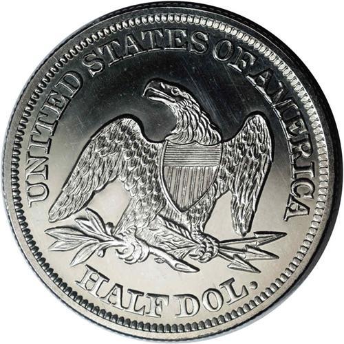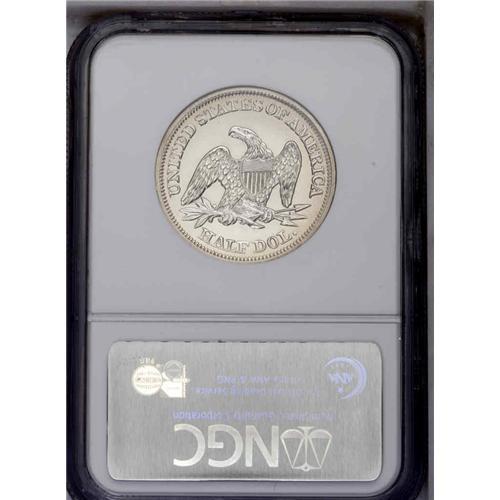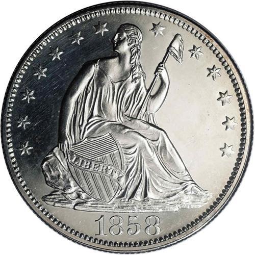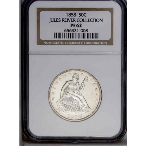 <B>1858<50C> PR62 NGC.</B></I> WB-101. Type One Reverse. A brilliant and carefully preserved piece that has chrome-like fields, as made. Cameo contrast is present but is prominent only when viewed from selected angles. The strike is good but not razor-sharp, a few stars and the eagle's left (facing) claw have not received a full blow from the dies.<BR>In terms of their distribution, 1858 proofs are transitional. Proofs were struck in prior years, generally for presentation purposes rather than for sale to collectors. Select issues, such as 1856 Flying Eagle Cents, were restruck by the Mint for well placed collectors. Beginning in 1859, proofs were struck for distribution to collectors, and are scarce but affordable for modern numismatists. The 1858 proofs have an unknown mintage, and are significantly scarcer than the 1859 and subsequent issues. However, they are obtainable, while pre-1858 Seated Half proofs are very rare. Perhaps the decision to strike proofs for collectors was made in the later part of 1858, which would explain the small but collectible number of proof survivors. Population: 8 in 62, 38 finer (9/05).