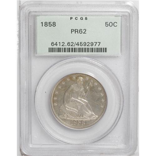 <B>1858<50C> PR62 PCGS.</B></I> The reflective fields are covered by myriad contact marks, planchet flakes, and lint marks, mostly present at the time this piece was struck. Both sides are fully mirrored with faint champagne toning. A scarce date, first of the series available to collectors on a regular basis directly from the Mint in the year of issue.