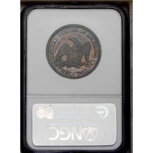<B>1858<50C> PR63 NGC.</B></I> A historic issue, from the first year that the Mint began large-scale public offerings of proof coins to the public under Director James Ross Snowden. This example is deeply coated in plum and blue hues, with a pleasing level of luster emanating from beneath. Well struck, but a few light contact marks show under a loupe. NGC has graded 19 coins finer (3/06). <BR><BR><B>Important notice:</B> Heritage usually auctions material at the rate of 200-250 lots per hour. On some occasions eBay Live bid software or the Internet may not be able to keep up with the pace of the auction. We recommend placing a realistic absentee bid now as insurance to avoid disappointment. Occasionally the auctioneer may eliminate or reject an eBay Live bid, and the auctioneer may also reopen a lot after the close of the eBay live bidding (usually because we missed an audience bid), and may reject your bid even if it shows you as the winning bidder. By bidding via eBay Live, you agree that Heritage may award the lot to another bidder at its sole discretion under the circumstances described above or any other reasonable circumstances. Since eBay bids are not shown to us until we open the lot on the floor, we treat those bids just like floor bids. In most cases the floor responds before the eBay bid is presented to us, due to Internet lag time, so for consistency we have made it a policy that floor bids are always considered first over tie eBay live bids. Also please note that all Heritage lots purchased through eBay Live carry a 20% Buyer's Premium. Please make sure you read the Terms and Conditions before you bid. This lot is being auctioned in conjunction with a live floor auction by Heritage Galleries & Auctioneers. All final auction and invoice information will be supplied by Heritage Galleries & Auctioneers, and all other information should be considered preliminary. Lot:2028 <BR><BR><B>Winning Notification and Billing:</B> After the FINAL session in this auction is complete, Heritage will send e-mail and snail mail invoices. This process normally takes several days. All final auction and invoice information will be supplied by Heritage Galleries & Auctioneers, and all other information should be considered preliminary. <BR><BR>This auction will be conducted on a live auction floor and over the Internet through eBay Live. If you choose to place an absentee bid, please take a moment to <font color='#0000ff'><u><a href='http://pages.ebay.com/liveauctions/help/before/laabsentee.html'>learn how eBay Live absentee bidding works</a></u></font><font color='#000000'>