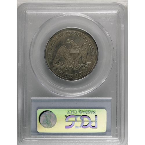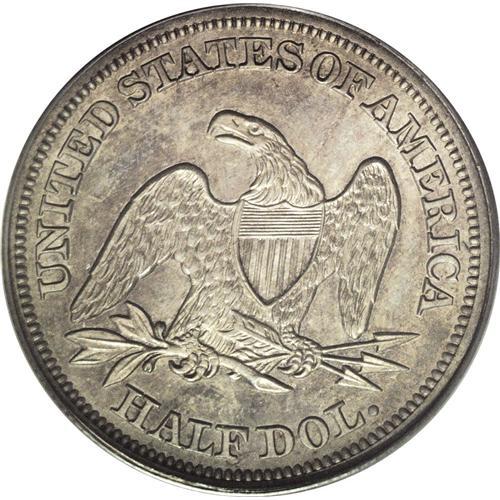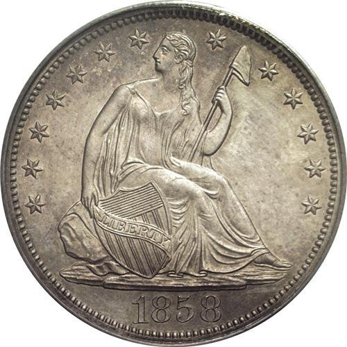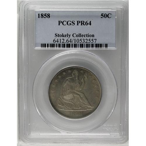 <B>1858<50C> PR64 PCGS.</B></I> Type One Reverse. 1858 was the year that proof half dollars were first offered for sale to the general public. Unfortunately, no mintage figure has survived, although the <I>Guide Book</B></I> estimates 300+ proofs were coined. This small emission makes the 1858 the key date to the proof Seated half series, although the two Arrows issues are also coveted. The present sharply struck and unblemished example has rich orange-tan and steel-blue patina. Population: 19 in 64, 4 finer (6/06).<BR><I>From The Stephen Stokely #1 PCGS Registry Set of Proof Seated Half Dollars.</B></I>