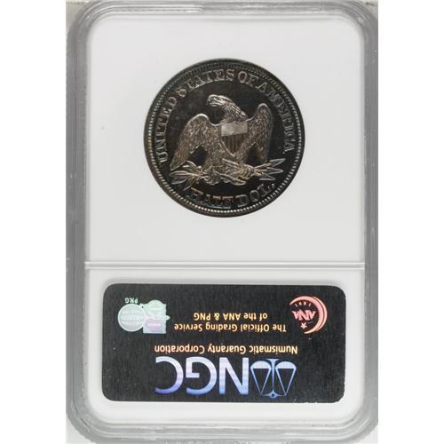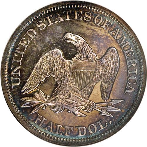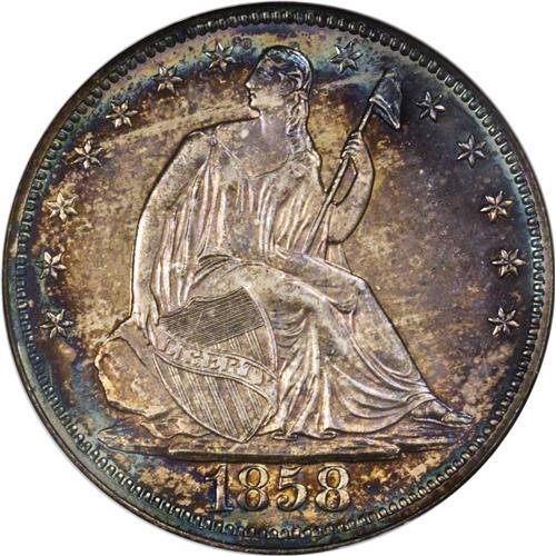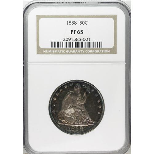 <B>1858 50C PR65 NGC.</B></I> Type One Reverse. On the Type One reverse, the tops of LF nearly touch, the claws are long and closed, and the arrowheads are large. Waves of golden-brown, ocean-blue, and plum patina enrich this impressive Gem. Only Liberty's breasts and the eagle's left (facing) claw lack pinpoint detail; all of the star centrils are full, and Liberty's gown clasp, hair details, and the eagle's feathers are fully articulated. A few small obverse strikethroughs are detected, but they do not alter the technical grade or the aesthetic appeal. 1858 is a key date for proof Seated halves, and has an unknown (but low) production. Census: 6 in 65, 4 finer (12/06).<BR><BR><b>Shipping:</b> Coin/Currency (<a target="_blank" href="http://www.heritageauctions.com/common/shipping.php">view shipping information</a>)