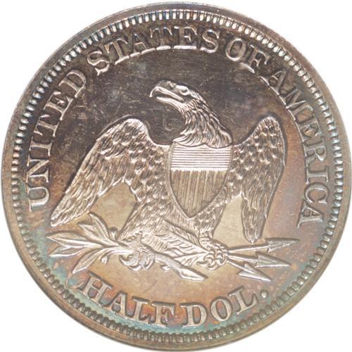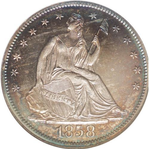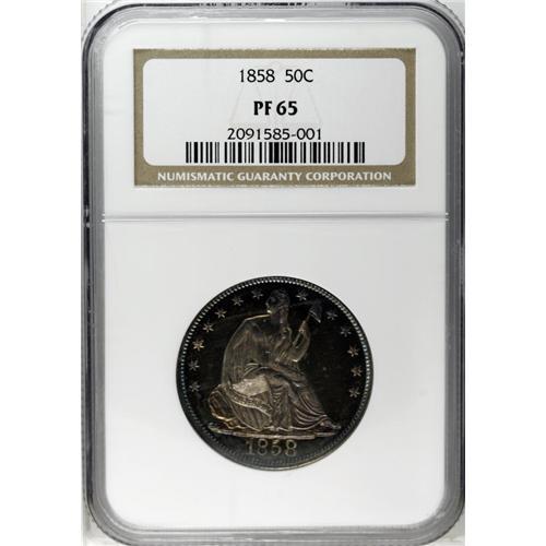 <B>1858<50C> PR65 NGC.</B></I> Type One Reverse. Waves of golden-brown, ocean-blue, and plum patina enrich this impressive Gem. Only Liberty's breasts and the eagle's left (facing) flaw lack pinpoint detail. A few small obverse strike-throughs are detected, but these do not alter the technical grade. 1858 is a key date for proof Seated halves, and has an unknown (but low) production. Census: 6 in 65, 4 finer (6/06).<BR><I>From The Mulholland Collection.</B></I>