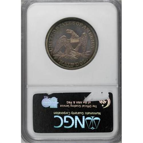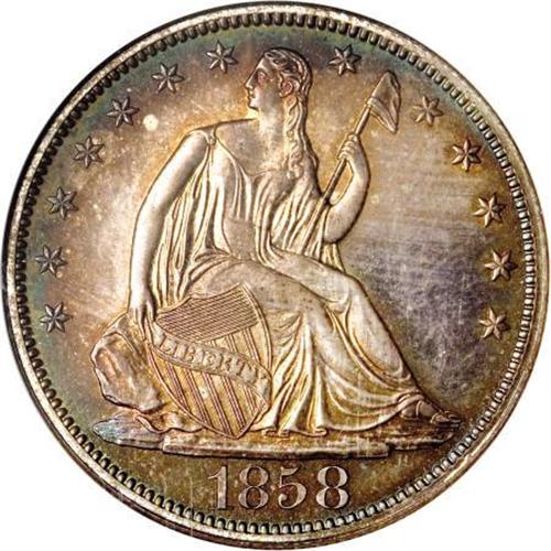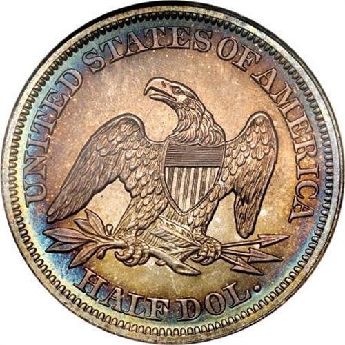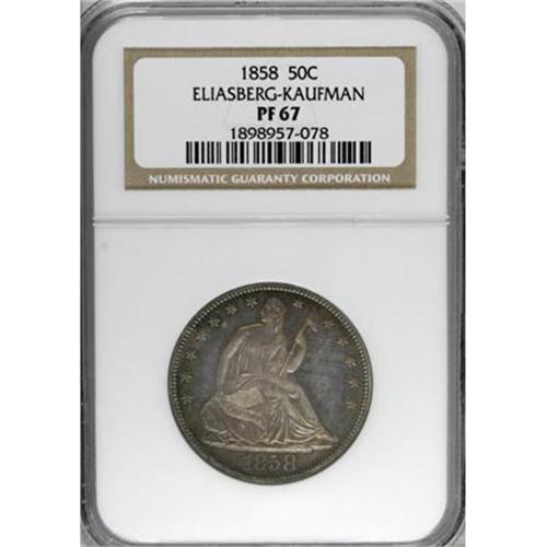 <B>1858 50C Half Dollar PR67 NGC.</B></I> Ex: Eliasberg-Kaufman. This stunning Superb Gem is certainly a coin that will please the connoisseur. It is an amazing Superb Gem that ranks high in the census of this date, probably the second finest known. Dave Bowers writes in the Eliasberg catalog that “it would be difficult to imagine a more aesthetically pleasing coin no matter what its technical grade might be.” <BR> Like the other denominations, the mintage is unknown, but probably nearly the same as the smaller silver coins of this year, perhaps a couple hundred each. Total population data from third party grading services may provide a clue. It is believed that the 1858 proof half dollar is rarer than the other denominations, due to a lower mintage or a lower survival rate, probably the latter. The NGC <I>Census Report</B></I> shows the following totals for each denomination of proof 1858 silver coins: half dime (76), dime (64), quarter (60), half dollar (46), silver dollar (67). Immediately evident is the substantially lower total for the half dollar.<BR> Carefully made dies show few identifying characteristics. The date appears to be centered in the space below the base, although it has been described as a "low date" by some past numismatic scholars. The reverse has indefinite vertical lines at the bottom of the third stripe in the shield. Two tiny spurs jut out from the rightmost element of the fifth vertical stripe. Diagonal striations can be seen within the shield and below the right facing wing, although these are faint and only visible as a result of the highly mirrored surfaces. Similar striae at the same angle appears elsewhere, especially near part of the border.<BR> Peripheral blue, lilac, and russet toning surrounds pale champagne color over deeply mirrored proof surfaces with light cameo contrast. Every detail is boldly defined. Census: 1 in 67, 1 finer (6/07).<BR><I>Ex: Chapman Brothers; J.M. Clapp; John H. Clapp; Clapp Estate via Stack's (1942); Louis E. Eliasberg, Sr. (Bowers and Merena, 4/1997), lot 1974.<BR>From The Phil Kaufman Collection of Early Proof Sets, Part One.</B></I> (#6412)<BR><BR><BR><B>Coin Engraver:</B> Christian Gobrecht<BR><BR><b>Shipping:</b> Coins & Currency (<a target="_blank" href="http://www.heritageauctions.com/common/shipping.php">view shipping information</a>\)