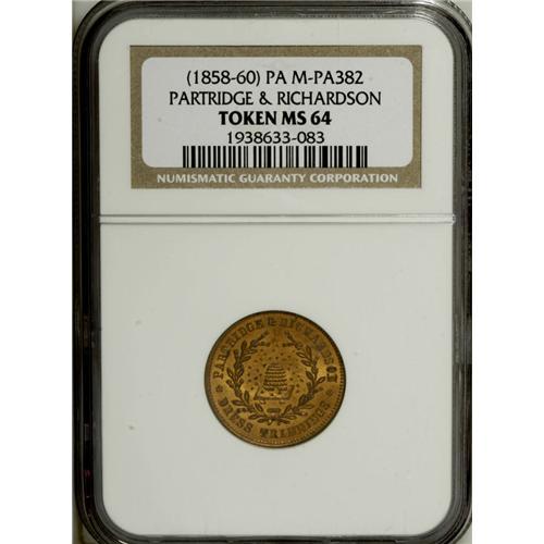 <B>(1858-59) Samuel Hart & Co., Philadelphia, PA, MS61 NGC,</B></I> M-PA-196A, a dusky olive-green example with distributed minor marks; <B>(1858-60) Partridge & Richardson, Philadelphia, PA, MS64 NGC,</B></I> M-PA-382, mostly yellow-gold despite gunmetal toning on the reverse field, a tiny spot below the horse; and an <B>(1853) W.H. Richardson, Philadelphia, PA, MS64,</B></I> M-PA-417, a gorgeous yellow-gold near-Gem, a blue fleck on the obverse center.<BR><BR><b>Shipping:</b> Coin/Currency (<a target="_blank" href="http://www.heritageauctions.com/common/shipping.php">view shipping information</a>)
