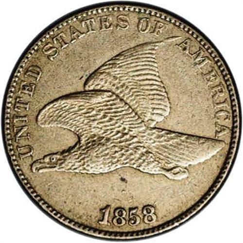 <B>1858/7<1C> AU58 NGC.</B></I> Olive tan surfaces. A typical strike with softness noted at the eagle's tail and at the highpoints of the wreath. Only a tiny vestige of the 7 in still visible in the date, but the variety can be readily identified by the presence of a die chip in the field midway between the date and the eagle's abdomen. Another tall-tale sign is that the tip of the eagle's right wing is detached. Envelope Included.
