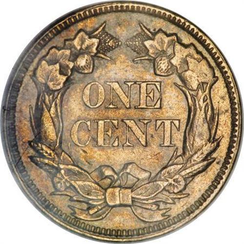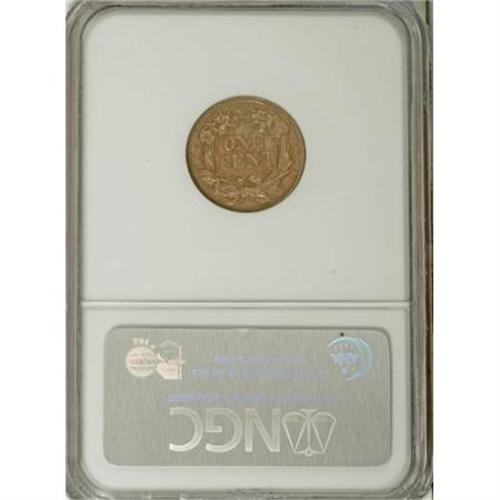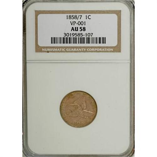 <B>1858/7 1C AU58 NGC.</B></I> VP-001. FS-006, Snow-1. Large Letters, High Leaves, Closed E. The "flag" or upper right corner of a 7 can be seen above the second 8, and there is a raised dot in the field above the first 8 which is unique to the genuine overdate, and is used as a diagnostic <I>(Cherrypickers' Guide</B></I>, Third Edition). This AU58 specimen displays golden-tan surfaces with blushes of violet. Nicely struck and minimally abraded.<BR><BR><B>Coin Engraver:</B> James B. Longacre<BR><BR><b>Shipping:</b> Coins & Currency (<a target="_blank" href="http://www.heritageauctions.com/common/shipping.php">view shipping information</a>)
