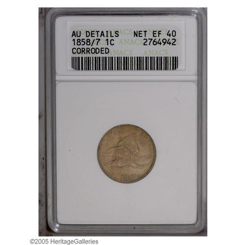 <B>1858/7<1C>--Corroded--ANACS. AU Details, Net XF40.</B></I> Snow-1, FS-006. A sharp if minutely granular representative of this important variety. A trace of the upper right corner of the underdigit 7 is apparent, and the diagnostic die lump above the 8 is prominent. There are no consequential marks.