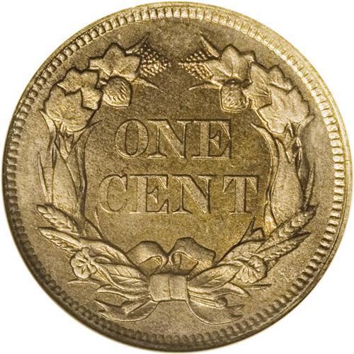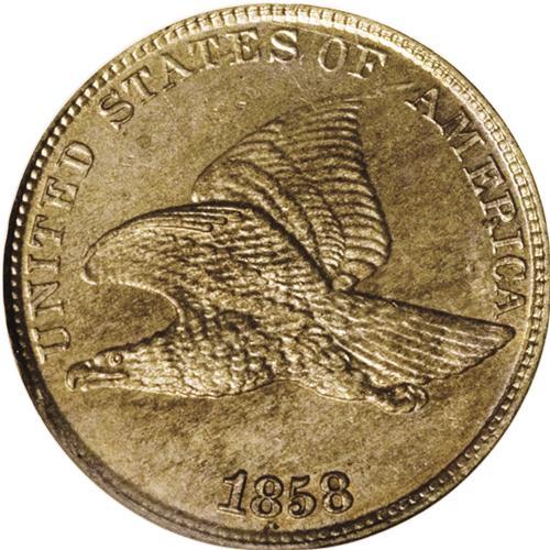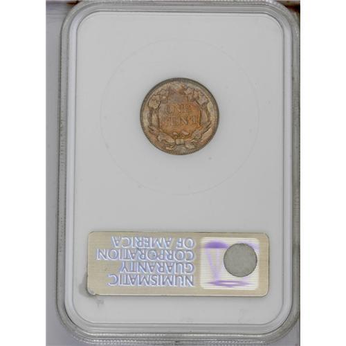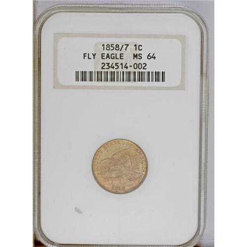 <B>1858/7<1C> MS64 NGC.</B></I> FS-006, Snow-1. Large Letters Obverse, High Leaves Reverse, Closed E in ONE. Snow's Die Stage B, which exhibits a trace of the upper right corner of the underdigit 7. The diagnostic die lump centered above the 85 in the date confirms the variety. Attribution is also aided by the presence of a broken wingtip near 1 o'clock. If the 1856 is regarded as a pattern, the 1858/7 becomes the key date to a collection of Flying Eagle cents. This satiny near-Gem has orange, powder-blue, and gray-gold toning. The devices are crisply struck, and marks are limited to a few trivial ticks on the upper left obverse field. Encapsulated in an older generation NGC holder. Census: 35 in 64, 5 finer (8/06).