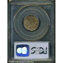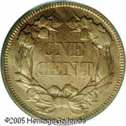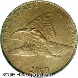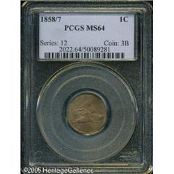 <B>1858/7 1C MS64 PCGS.</B></I> FS-006. Snow-1. All of the diagnostics for this valuable Flying Eagle overdate are clearly discernible with the aid of light magnification. The strike is predictably substandard on the eagle's tail feathers and the highpoints of the wreath, while a mixture of deep tan and crimson-red color overall. The patina presents as streaky on the reverse, but good luster remains under the toning. Lot:5186