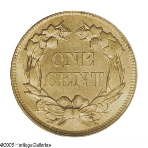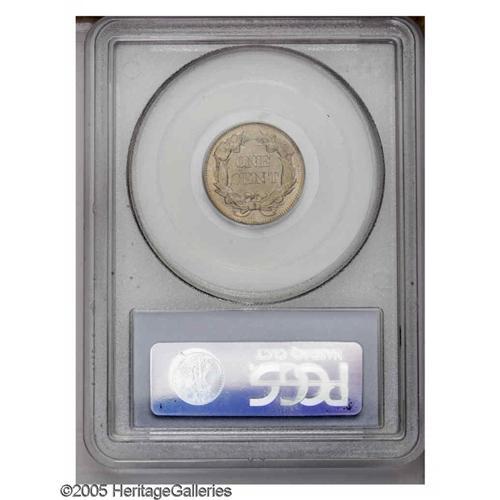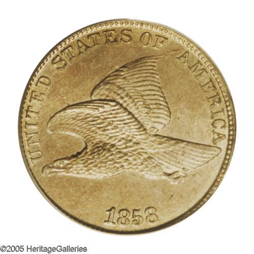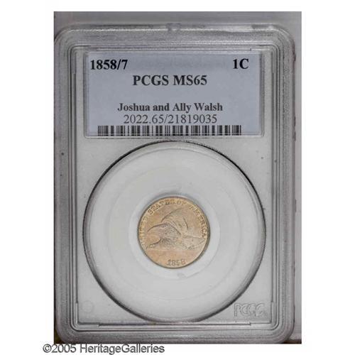 <B>1858/7<1C> MS65 PCGS.</B></I> Snow-1. Die Stage B. A rare Gem quality representative of this popular overdate Flying Eagle Cent, this coin exhibits a strike from a much later state of the dies. The wingtip is clearly detached, the corner of the 7 underdigit is all that remains, and the base of the errant 1 in the obverse field, while still perceptible under a loupe, is faint.<BR> This is an aesthetically pleasing example with dominant honey-gold color over which splashes of pale reddish patina have gathered, mostly on the obverse. Both sides are equally free of bothersome carbon and there are no mentionable marks or impairments. The strike is a little uneven, but most major features are well defined. A tiny planchet indention is noted above the E of ONE, this being mentioned only for pedigree purposes. An important opportunity for the Small Cent specialist.<BR><I>From The Joshua and Ally Walsh Collection of United States Cents.</B></I>