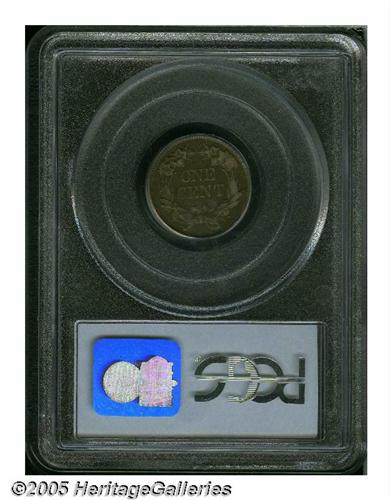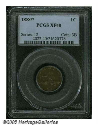 <B>1858/7<1C> XF40 PCGS.</B></I> Snow-1. Both sides are evenly toned in deep, steel-brown shades. The wear is a little more extensive on the highpoints, but all of the design elements remain very clear. Faint remnants of the underdigit are seen above and to the right of the final 8 in the date, and the eagle's wingtip is severed from the other feathers.