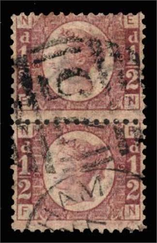 1870 ½d rose (SG 49) plate 9, vert pair, good perfs and lightly used with part duplex cancel, minor imperfections, attractive example of difficult stamp, cat £1,200