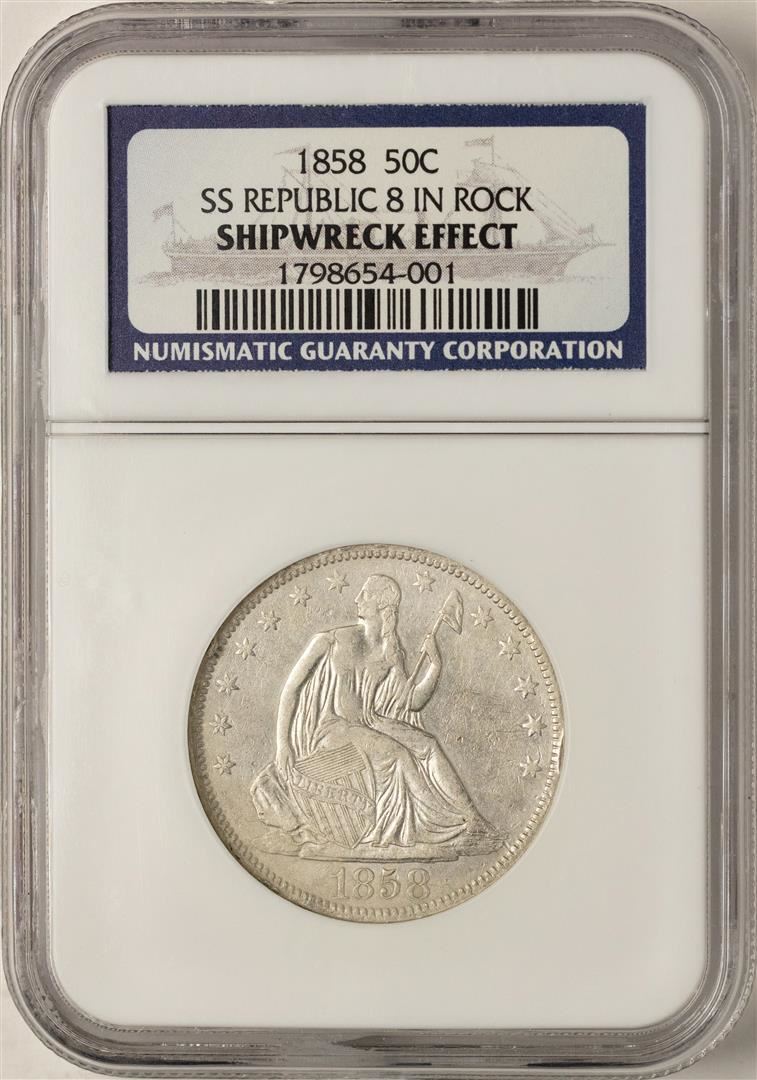 One 1858 8 in Rock SS Republic Seated Liberty Half Dollar Coin NGC Shipwreck Effect w/Book. NGC Certified.
