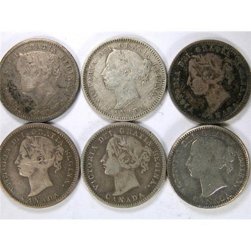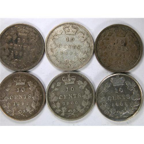 Canada Ten Cents 1858, 1890H, 1891 22 Leaves, 1892 Obverse 5, 1900 and 1901, all Fine and pale to lightly toned