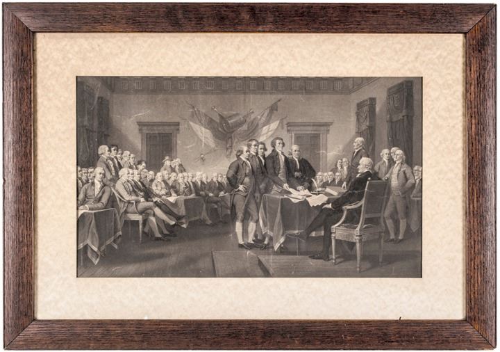 The Engraved Print is fully titled: “DECLARATION OF INDEPENDENCE of the United States of America. July 4th, 1776” presented in a simple heavy oak wooden period frame from which the print can be removed for ease of shipment. This c. 1858 period Print is on thick sheet of wove print paper which retains its original wide full-size margins, has some overall tone and slight use likely acquired during its prior framing. There was old tacking glue used to hold the print in place against the mat cover along the top margin. This is relatively minor and would not be seen when re-framed as it would be fully covered by its mat. There are minor scattered creases in this Print which shows John Trumbull’s famous painting of the Signing of the Declaration of Independence. John Hancock is shown seated in the foreground as John Adams, Roger Sherman, Robert Livingston, Thomas Jefferson, and Benjamin Franklin present him with the Declaration for his signature. The many delegates from the other states are seated or standing around the perimeter of the room in the background. The printed text immediately below the engraved image on the margin reads: (After) “Painted by JOHN TRUMBULL - Engraved by ALEX. JAZET - PRINTED by GOUDPIL & Co. - NEW YORK Published by M. KNOSDLER - PARIS - LONDON - BERLIN Published 1st October 1858 by GOUPIL & Co.” This current example is a very historic American piece commemorating one of the proudest moments in the history of these United States.