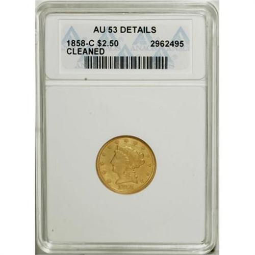 <B>1858-C $2 1/2 --Cleaned--ANACS. AU53 Details.</B></I> Variety 18-J. The obverse is hairlined, and the reverse is slightly bright, but the strike is bold for a Charlotte issue, and there are no individually noticeable marks.<BR><BR><B>Coin Engraver:</B> Christian Gobrecht<BR><BR><b>Shipping:</b> Coins & Currency (<a target="_blank" href="http://www.heritageauctions.com/common/shipping.php">view shipping information</a>)