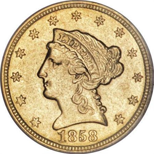 <B>1858-C $2 1/2 AU53 PCGS.</B></I> Variety 18-J. Gold coinage at Charlotte declined as the 1850s progressed, since the North Carolina mines were tapped out, and West Coast gold was struck at San Francisco instead of shipped across the Panama isthmus. The 1858-C was the only C-mint issue between 1857 and 1859, and was limited to 9,056 pieces. This briefly circulated example has a smooth straw-gold appearance despite a couple of mint-made strike-throughs near the eagle. The reverse has minor translucent residue at 5 o'clock.<BR><BR><B>Coin Engraver:</B> Christian Gobrecht<BR><BR><b>Shipping:</b> Coins & Currency (<a target="_blank" href="http://www.heritageauctions.com/common/shipping.php">view shipping information</a>)