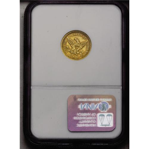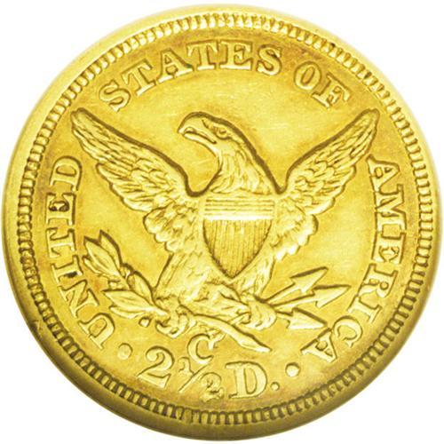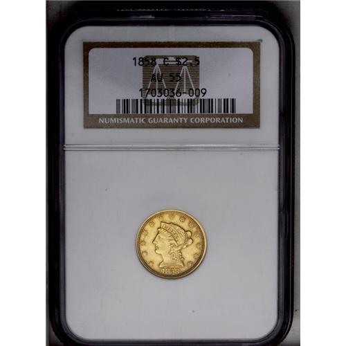 <B>1858-C<$2 1/2> AU55 NGC.</B></I> Variety 18-J. Another low-mintage Charlotte Mint issue, the 1858-C was minted only to the extent of 9,056 pieces, although AU specimens are more available than many earlier issues. This pretty two-toned example offers copper-gold at the rims, with straw-gold centers complemented by largely pristine surfaces. A few slight abrasions can be seen on the cheek under a loupe, and the strike through the center is typical. The overall eye appeal is high. Census: 17 in 55, 59 finer (5/06).