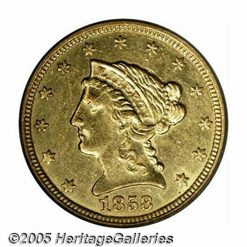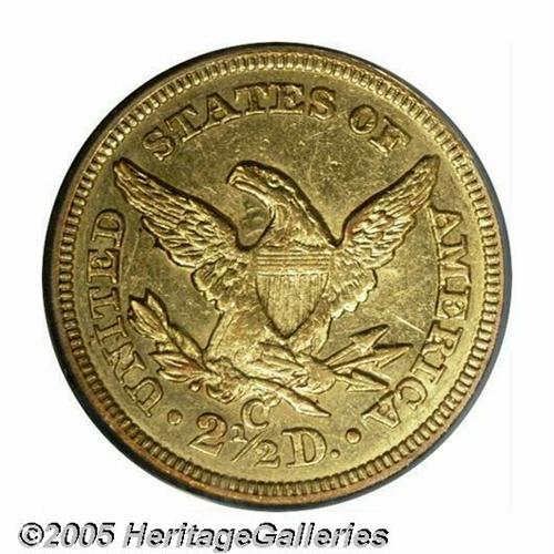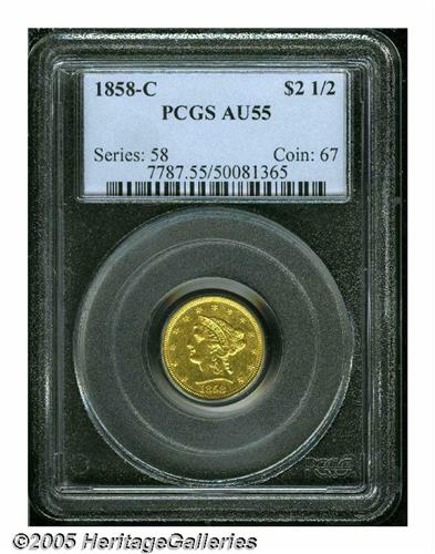 <B>1858-C<$2 1/2> AU55 PCGS.</B></I> Variety 18-J, the only known die pairing for the date. One of the more common Quarter Eagles from the Charlotte mint, yet still a very scarce coin overall. Ample luster remains in the fields of this lightly circulated example. The surfaces are slightly granular with only a few small circulation marks.