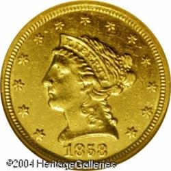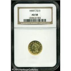 1858-C $2 1/2 AU58 NGC. A heavily circulated issue <B>1858-C $2 1/2 AU58 NGC.</B></I> A heavily circulated issue, the 1858-C is the only C-mint Quarter Eagle of the 1857-1859 era. Despite this fact, and also despite a paltry original mintage of 9,056 pieces, the '58-C is the most common C-mint Quarter Eagle from this decade, and Winter states that 100-110 coins are extant. Most survivors do not, however, grade any finer than XF. This nearly Uncirculated specimen is richly colored in olive-gold shades with remnants of a semi-prooflike finish. Boldly, if not sharply defined in virtually all areas with a typical number of small abrasions for a C-mint gold coin that saw actual circulation. Population: 25 in 58, 23 finer (10/04). <BR><BR><B>Important notice:</B> Heritage usually auctions material at the rate of 200-250 lots per hour. On some occasions eBay Live bid software or the Internet may not be able to keep up with the pace of the auction. We recommend placing a realistic absentee bid now as insurance to avoid disappointment. Occasionally the auctioneer may eliminate or reject an eBay Live bid, and the auctioneer may also reopen a lot after the close of the eBay live bidding (usually because we missed an audience bid), and may reject your bid even if it shows you as the winning bidder. By bidding via eBay Live, you agree that Heritage may award the lot to another bidder at its sole discretion under the circumstances described above or any other reasonable circumstances. Since eBay bids are not shown to us until we open the lot on the floor, we treat those bids just like floor bids. In most cases the floor responds before the eBay bid is presented to us, due to Internet lag time, so for consistency we have made it a policy that floor bids are always considered first over tie eBay live bids. Also please note that all Heritage lots purchased through eBay Live carry a 20% Buyer's Premium. Please make sure you read the Terms and Conditions before you bid. This lot is being auctioned in conjunction with a live floor auction by Heritage Galleries & Auctioneers. All final auction and invoice information will be supplied by Heritage Galleries & Auctioneers, and all other information should be considered preliminary. Lot:6505