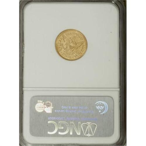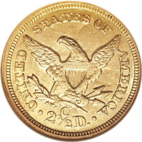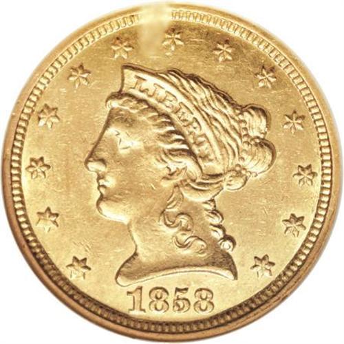 <B>1858-C $2 1/2 AU58 NGC.</B></I> Variety 18-J. This desirable Charlotte quarter eagle possesses ample flashy luster. The strike is a bit soft on the eagle's legs, but the remainder of the design is crisply defined. Refreshingly void of abrasions, although a few mint-made strike-throughs are noted on the reverse field near the eagle.<BR><BR><B>Coin Engraver:</B> Christian Gobrecht<BR><BR><b>Shipping:</b> Coins & Currency (<a target="_blank" href="http://www.heritageauctions.com/common/shipping.php">view shipping information</a>\)
