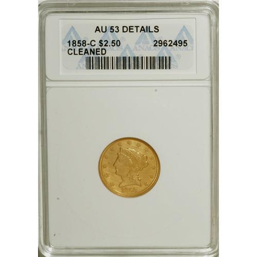 <B>1858-C $2 1/2 --Cleaned--ANACS. AU53 Details.</B></I> Variety 18-J. The obverse is hairlined, and the reverse is slightly bright, but the strike is bold for a Charlotte issue, and there are no individually noticeable marks.<BR><BR><b>Shipping:</b> Coins & Currency (<a target="_blank" href="http://www.heritageauctions.com/common/shipping.php">view shipping information</a>)