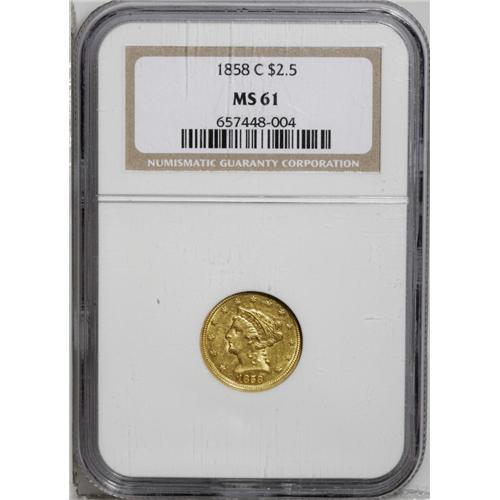 <B>1858-C<$2 1/2> MS61 NGC.</B></I> Variety 18-J. Rich, frosted luster radiates from the greenish-gold surfaces. The strike is fairly well executed, with some weakness on the hair curl above the ear, but generally good throughout. A straight line through the jawline area, somewhat resembling an adjustment mark, is clearly of mint origin. Some old clash marks are seen on the reverse, along with a small patch of ticks in the field above the eagle's beak. Light field chatter and other small abrasions, none individually significant, constitute the grade on this appealing and strictly Mint State example. Census: 12 in 61, 10 finer (7/06).